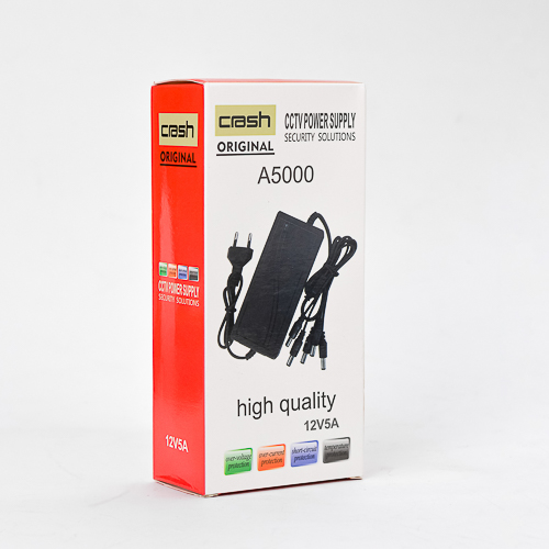 مصدر طاقة Power Supply CCTV Crash A5000 لكاميرات المراقبة، 12 فولت، 5 أمبير، 4 مخارج، حماية متكاملة، أداء مستقر وموثوق لجميع أنظمة CCTV.